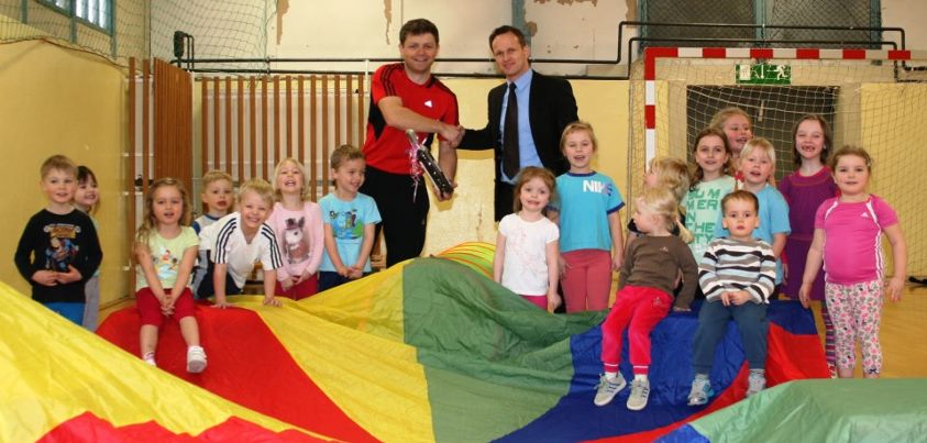 Seit Februar dieses Jahres treffen sich die sportinteressierten Langensteiner Kinder im Alter von drei bis sechs Jahren einmal wöchentlich zum Kindersport in der Langensteiner Sporthalle. Unter der Leitung der beiden Sportlehrer Burghardt und Sebastian Knobbe stehen hier das Sammeln vielfältiger Bewegungserfahrungen sowie der Spaß an der gemeinsamen sportlichen Betätigung im Vordergrund. Groß war kürzlich die Freude der Kinder, als der Halberstädter Finanz- und Versicherungsmakler Mario Heise einen Betrag in Höhe von 150 Euro spendete, welcher sofort in sportliche Klein- und Spielgeräte investiert wurde. Im Namen der Kinder sowie des Vorstandes bedankte sich Sebastian Knobbe mit einem kleinen Geschenk bei Mario Heise, der sich vor Ort selbst ein genaues Bild vom Ablauf der Trainingsstunde machte.